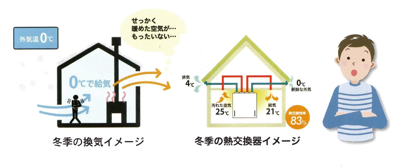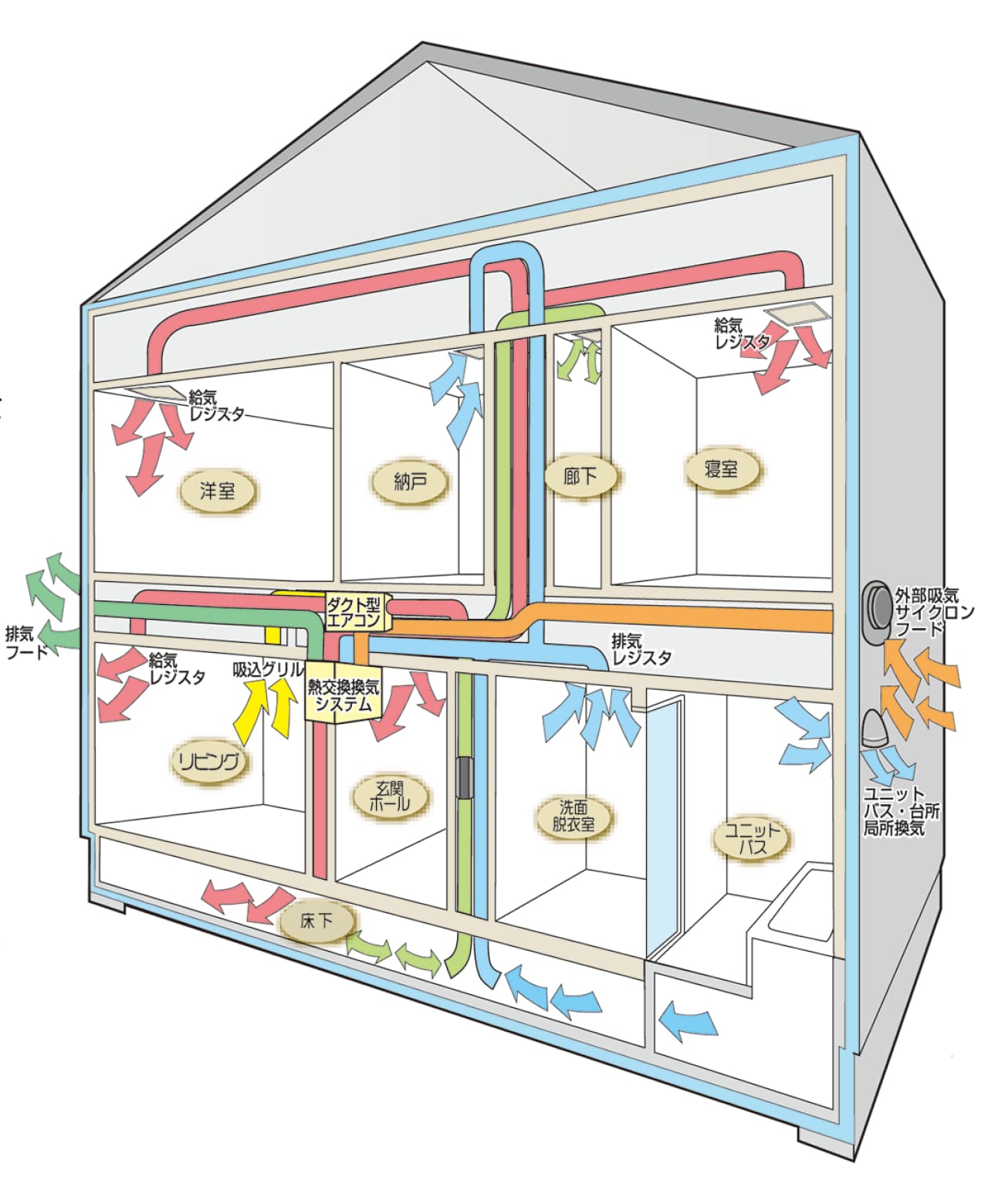 住宅環境先進国では、早くから高気密・高断熱住宅が発展していき、冷暖房についても検討がなされ、多くの改良工夫を経てきました。断熱性能住宅に適した冷暖房システムとして全館空調の選択肢は多くにのぼります。その中で1台換気システムは広がりを見せ、その中の空気循環が非常に効率的になります。エアコンの稼働の一つひとつも、熱交換換気は有効な不要室外気を使用しているにも関わらず、効率的に室内の熱の損なわない空気供給がされており、室温の快適さを確保できます。大きな電気代を消費する割に効率のよい熱回収による全熱交換の効果が見られるとても有効なシステムです。費用削減効果をもたらすことももちろんのこと無駄なエネルギーロスを防ぐことができます。