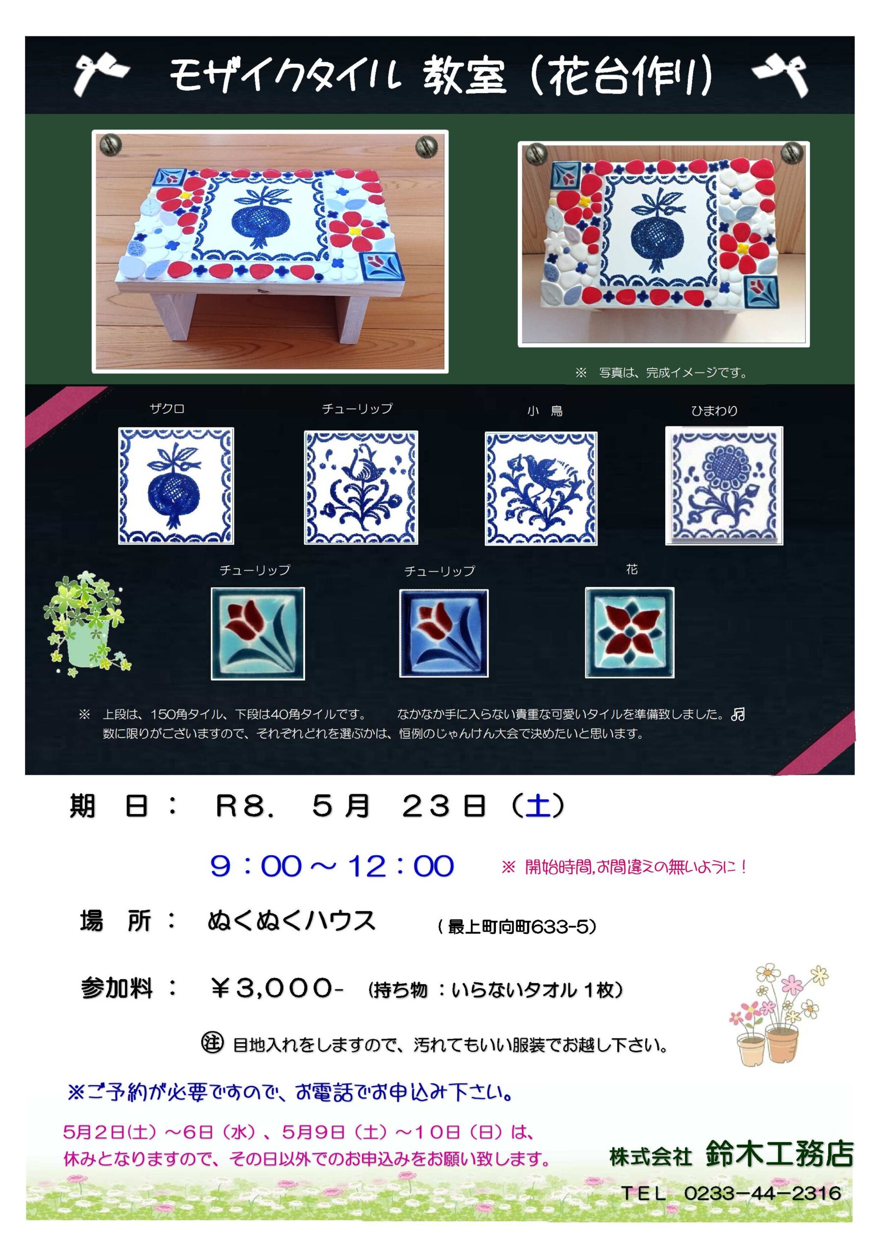 モザイクタイル教室(花台作り)のお知らせ