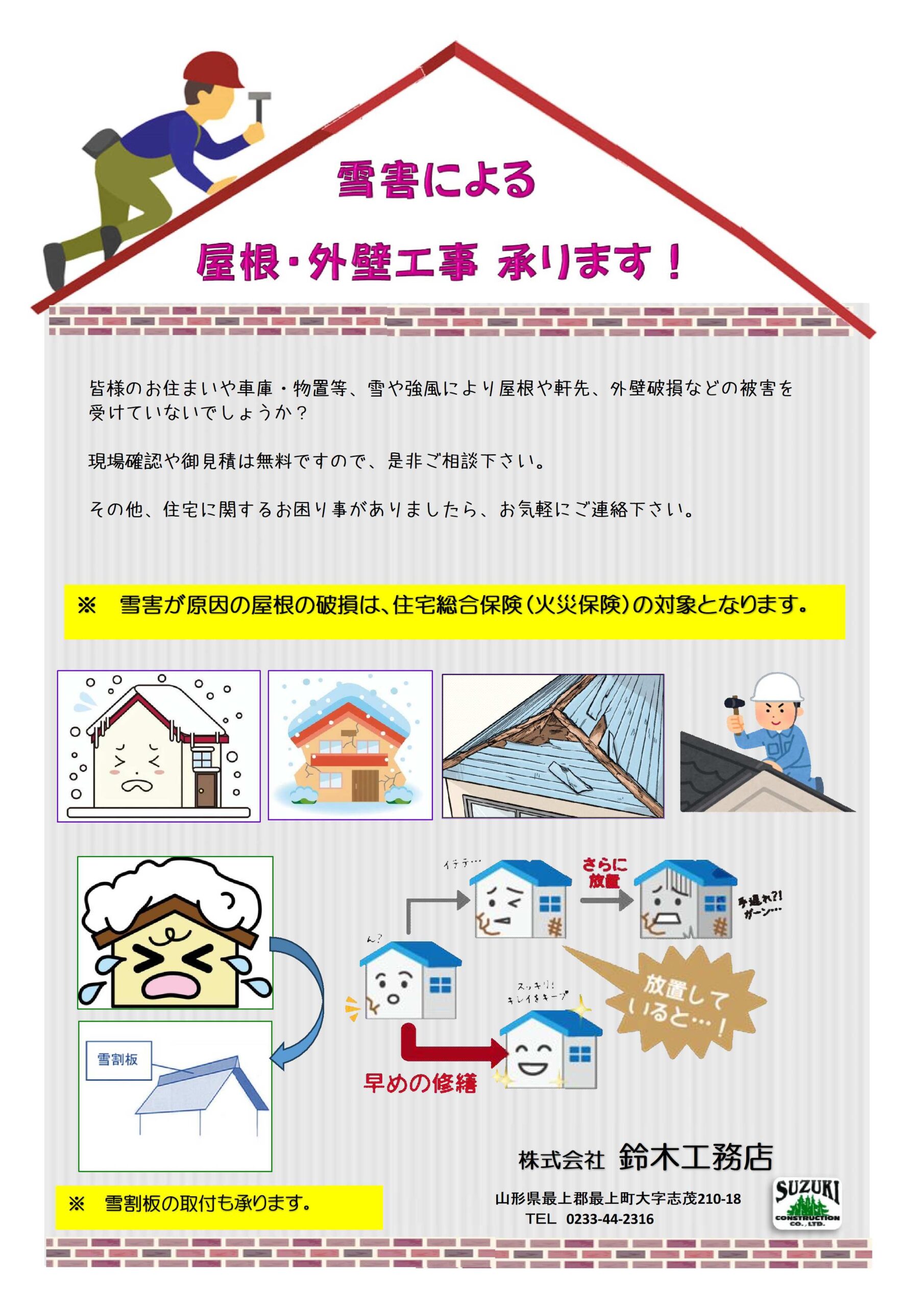 雪害による、屋根・外壁工事 承ります。